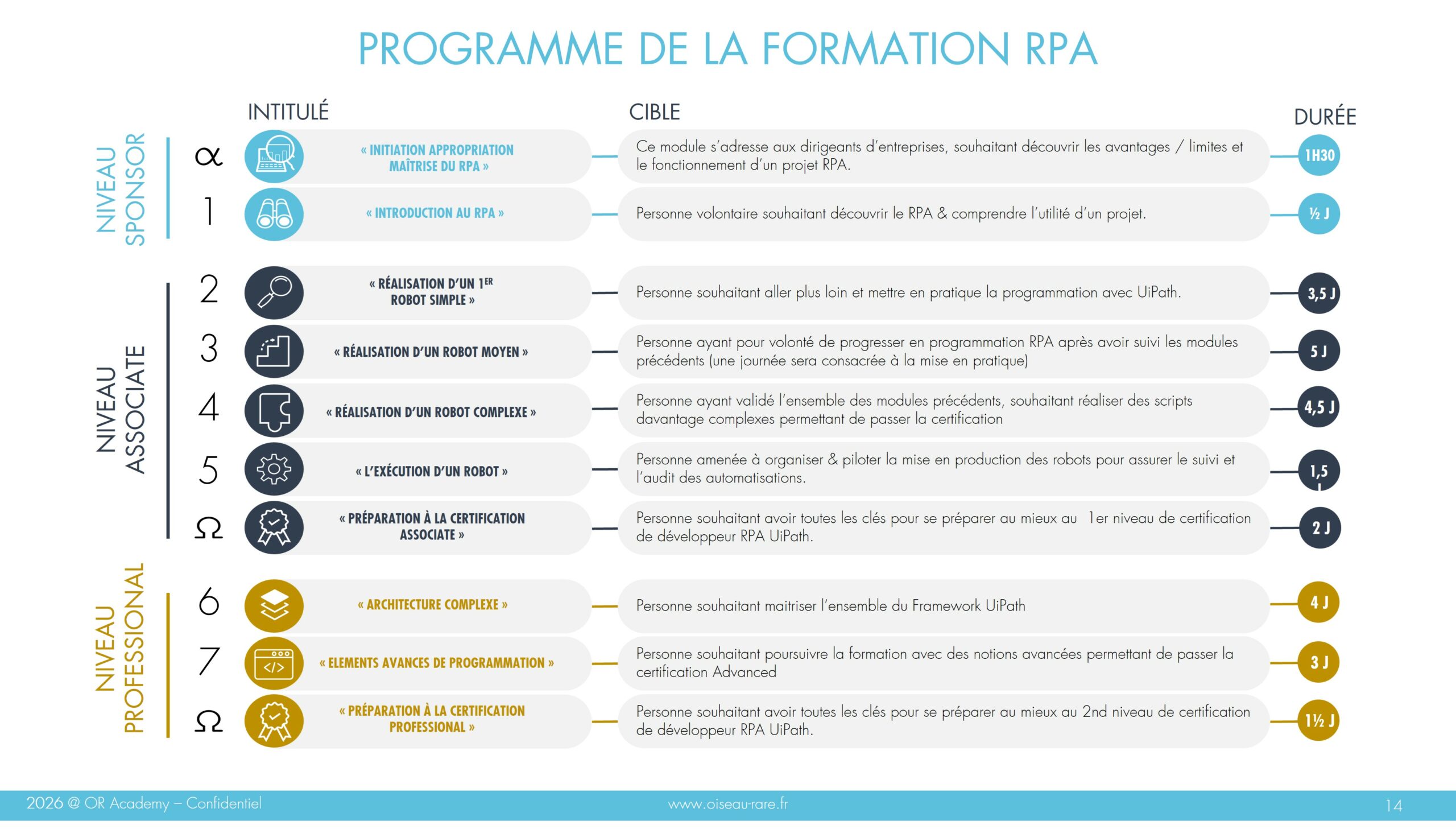 Progressant à travers 3 niveaux et 10 modules, chacun peut avancer à son rythme, depuis l’introduction au RPA jusqu’à la préparation à la certification UiPath, spécifiquement UiPath Certified RPA Associate.